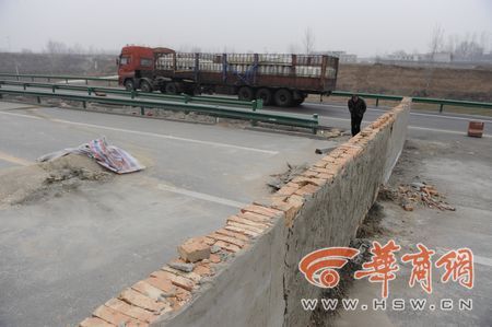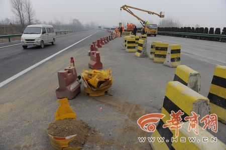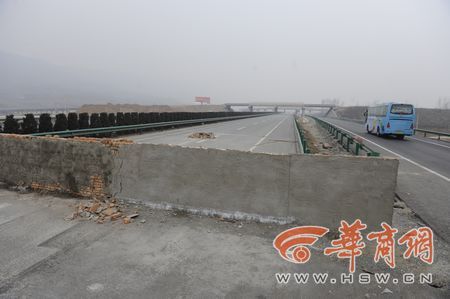 昨日上午,記者乘車從藍(lán)田東收費(fèi)站進(jìn)入滬陜高速前往西安方向,沒(méi)走多遠(yuǎn)就看到一溜塑料隔離墩引導(dǎo)著車輛向右行駛。隔離區(qū)域內(nèi),十余名工人正在吊裝安放水泥隔離墩,而高速路的正前方,則是用磚塊砌起來(lái)一堵墻,橫跨整個(gè)路面,整個(gè)墻上沒(méi)有任何交通標(biāo)識(shí)。鄒鐵琴指著已經(jīng)被抹上一層水泥的墻體說(shuō):“這就是我們那天撞上去的,這是剛剛補(bǔ)上的!庇浾吣繙y(cè)了一下,墻的高度在1.2米左右。一現(xiàn)場(chǎng)指揮的工作人員稱,被墻堵住的路是西商二線,由于工程沒(méi)有完工,所以將道路堵住。