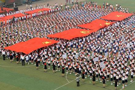 2000余名小學(xué)生排成方陣進(jìn)行“紅色傳遞”,四面長9米、寬6米的巨幅黨旗、國旗、團(tuán)旗、隊(duì)旗緩緩從頭頂劃過。