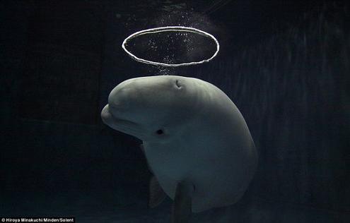 白鯨憨態(tài)可掬,兀自玩耍著一個圓圈狀水泡