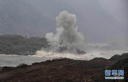 8月17日,第二次對巨石的爆破成功進(jìn)行。當(dāng)日,四川汶川縣映秀鎮(zhèn)對岷江紅椿溝段壅塞體進(jìn)行了兩次爆破,使泄洪渠得到有效拓寬。據(jù)爆破現(xiàn)場負(fù)責(zé)人介紹,爆破主要是為消除8塊巨石,這些巨石超出了挖掘機(jī)的負(fù)荷量,必須選擇爆破方式解決。